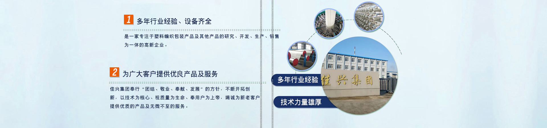 佳木斯市佳興塑業集團有限公司(以下簡稱“佳興集團”)成立于2009年,位于佳木斯市高新技術開發區。主要股東:董事長 常邵峰、監事 常佳興。公司占地面積94166平方米,注冊資金9800萬元,是佳木斯市政府招商引資項目之一,也是黑龍江省重點企業。2022 年實現產值6500余萬 元,營收5840余萬元,利稅589萬元,公司現有職工 196人,其中專業管理及工程技術人員 28 余人。 公司2014年通過“ISO9001質量管理體系認證”和“ISO14001環境管理體系認證”。2015年引進先進生產線,可實現年產各種類型塑料編織袋8000萬條。2016年公司獲批食品用塑料包裝容器工具等制品的“